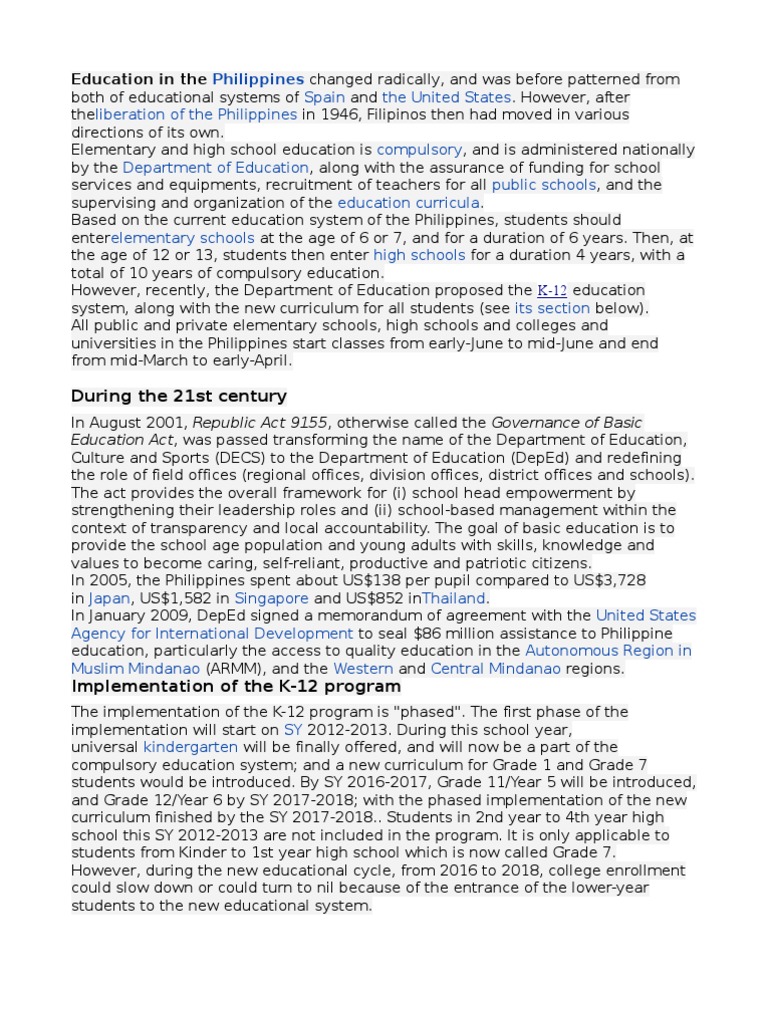 PHILIPPINE education | Curriculum | Secondary Education ... from imgv2-1-f.scribdassets.com Education in the philippines is managed and regulated by the department of education, commonly referred to as the deped in the country. Education in the philippines is provided by public and private schools, colleges, universities, and technical and vocational institutions in the country. Specifically, deped is accountable and responsible for: Secondary education, bilingualism, multilingualism, philippine education, english in the. Philippine education institutions in the late 1980s varied in quality. Every filipino child now has access to early childhood education through universal kindergarten. Although secondary education is provided free in public schools, participation rate has been inferior in in 1993, decs formulated a manual of information on secondary education of the philippines. At 5 years old, children start schooling and are given the means to slowly adjust to formal education.